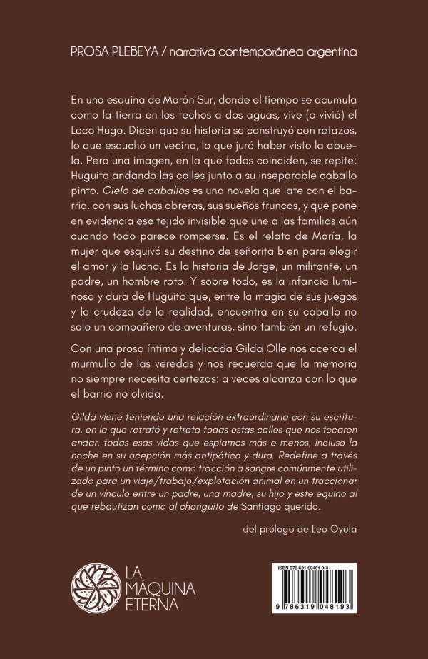 En una esquina de Morón Sur, donde el tiempo se acumula como la tierra en los techos a dos aguas, vive (o vivió) el Loco Hugo. Dicen que su historia se construyó con retazos, lo que escuchó un vecino, lo que juró haber visto la abuela. Pero una imagen, en la que todos coinciden, se repite: Huguito andando las calles junto a su inseparable caballo pinto. Cielo de caballos es una novela que late con el barrio, con sus luchas obreras, sus sueños truncos, y que pone en evidencia ese tejido invisible que une a las familias aún cuando todo parece romperse. Es el relato de María, la mujer que esquivó su destino de señorita bien para elegir el amor y la lucha. Es la historia de Jorge, un militante, un padre, un hombre roto. Y sobre todo, es la infancia luminosa y dura de Huguito que, entre la magia de sus juegos y la crudeza de la realidad, encuentra en su caballo no solo un compañero de aventuras, sino también un refugio.
